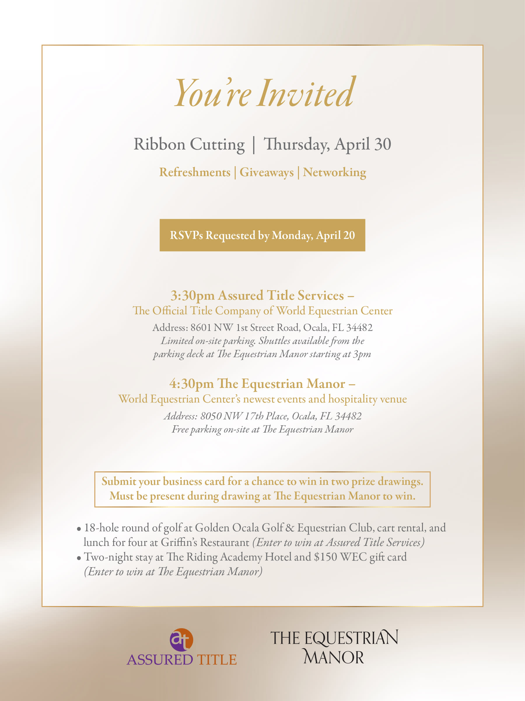 Join us as at WEC as we celebrate 2 Ribbon Cuttings! The first is for Assured Title Services at 3:30 and the second is at 4:30 for the Equestrian Manor. Assured Title kicks it off at 8601 NW 1st St Rd. Relocate within WEC to the Equestrian Manor at 8050 NW 17th Place. 1st Ribbon Cutting at 3:30 for Assured Title 8601 NW 1st St Rd, Ocala FL 34482 2nd Ribbon Cutting at 4:30 for Equestrian Manor 8050 NW 17th Place, Ocala, FL 34482